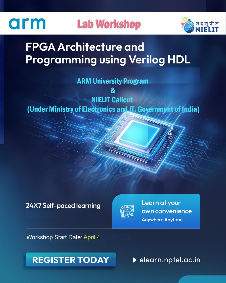 Starting Date: 4th April 2022 Exam Date: 30th April 2022Duration: 65 HoursEligibility: Engineering students, recent graduates and young professionals with back ground in Digital ElectronicsTheory: 13 hours, 24 x 7 Self PacedLab: 52 hours and lab schedule shall be intimated to studentsLink: https://elearn.nptel.ac.in/shop/partnering-courses/lab-workshop-fpga-architecture-and-programming-using-verilog-hdl/Fees: Rs 2000/- |