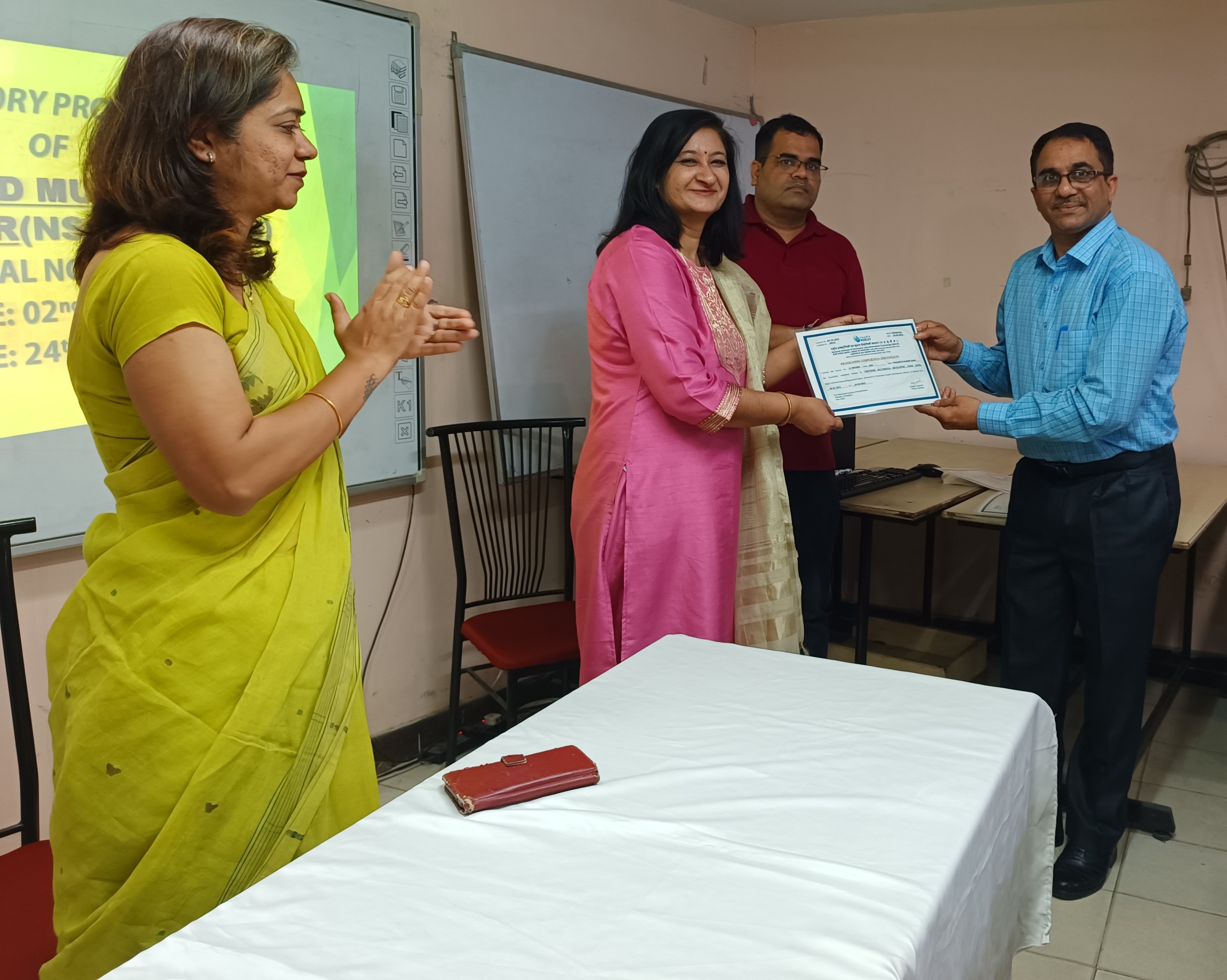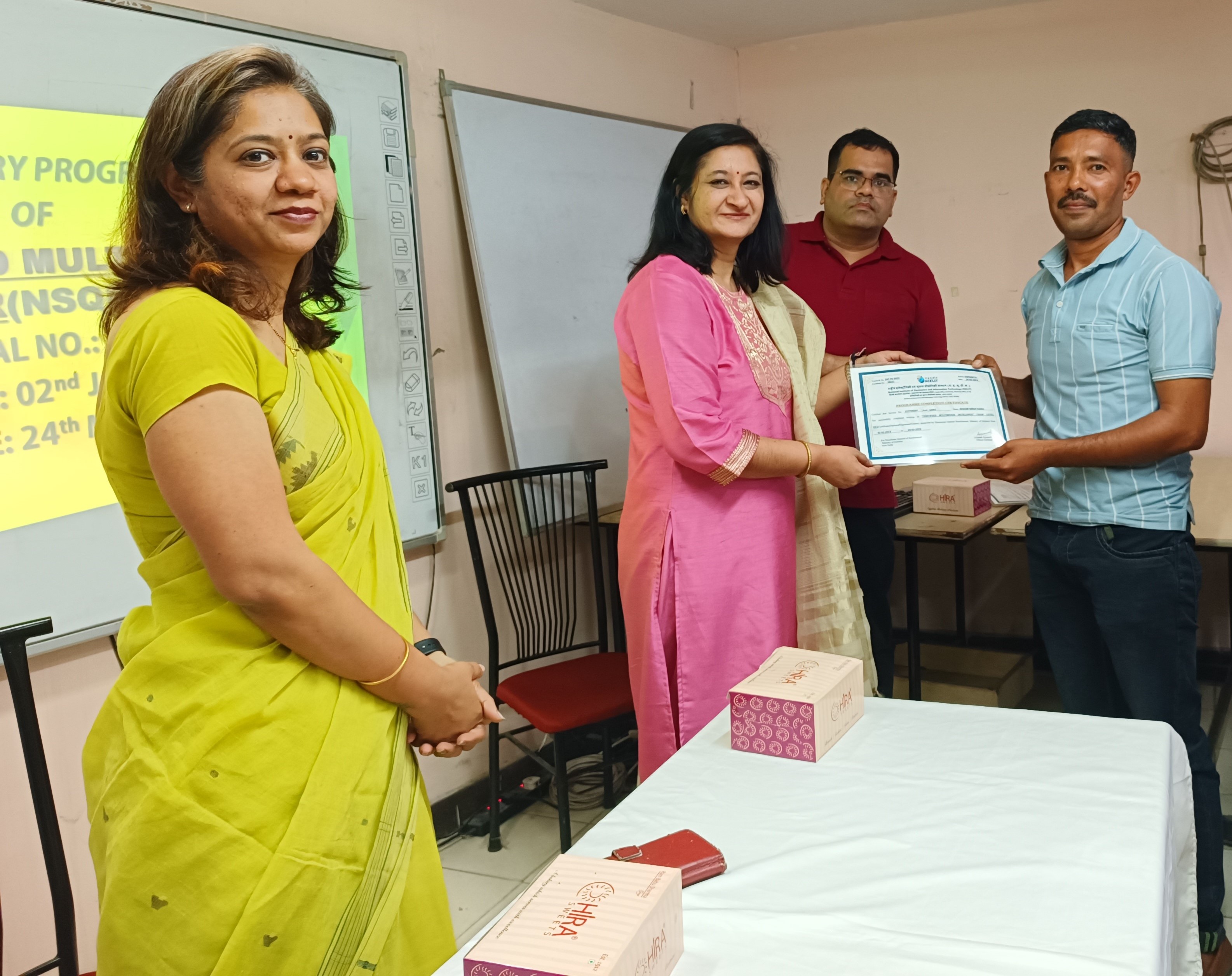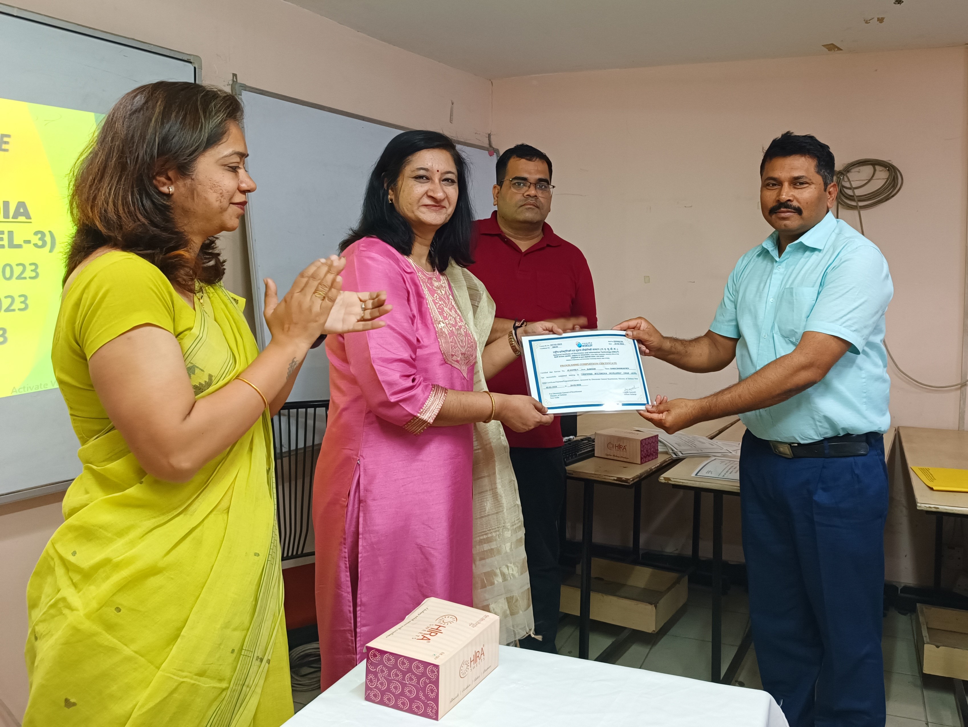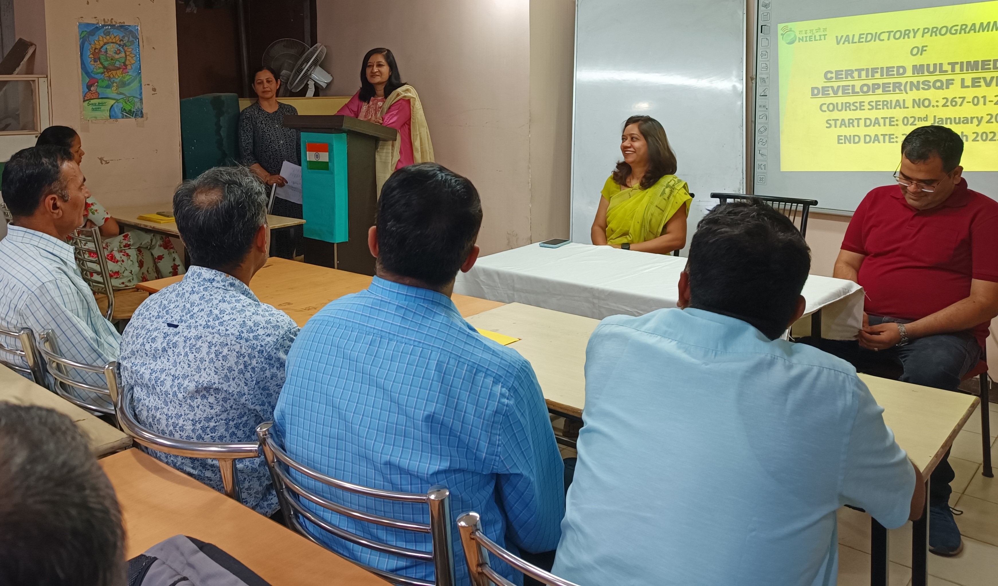 NIELIT Delhi Centre has successfully completed the training program in Certified Multimedia Developer (NSQF Level-3) course for JCOs/ORs conducted w.e.f. 2nd January 2023 to 24th March 2023. The valedictory programme for said batch was conducted on 24th March 2023. A total of 36 officials of the Indian Army, Navy and Air Force attended the training programme. Ms. Alpana Agrawal, Officer In-charge, NIELIT Delhi Office along with Ms. Swapnali Naik, Joint Director (Technical) awarded Certificates to all the officials and felicitated them for their successful completion of training.