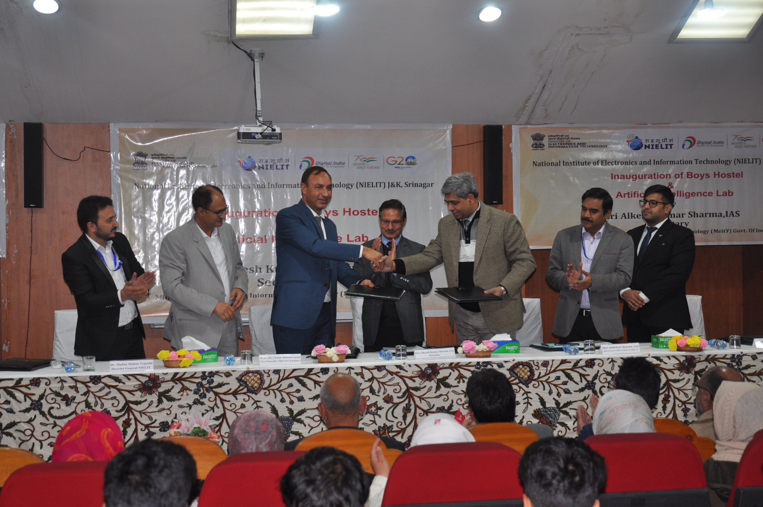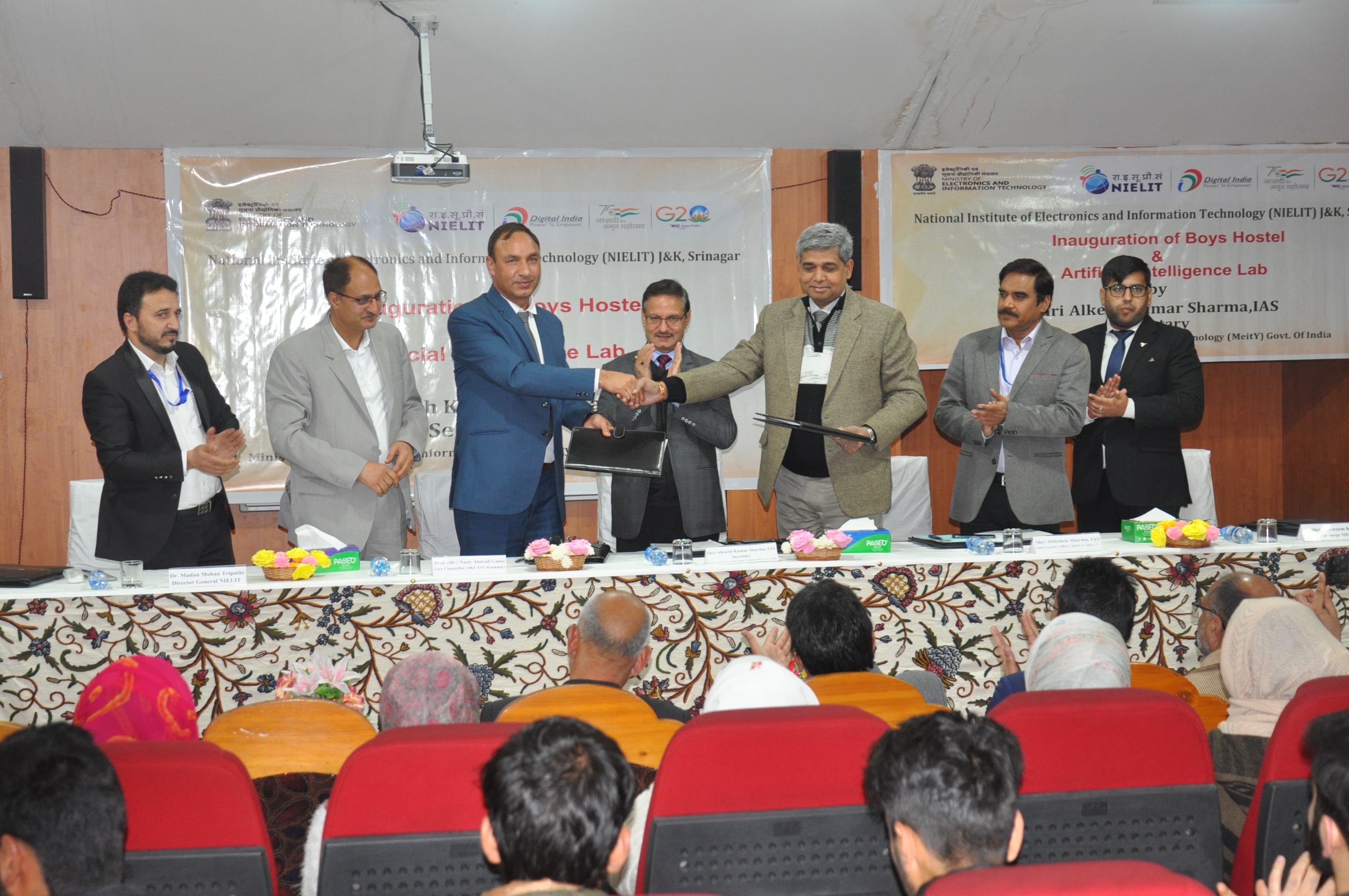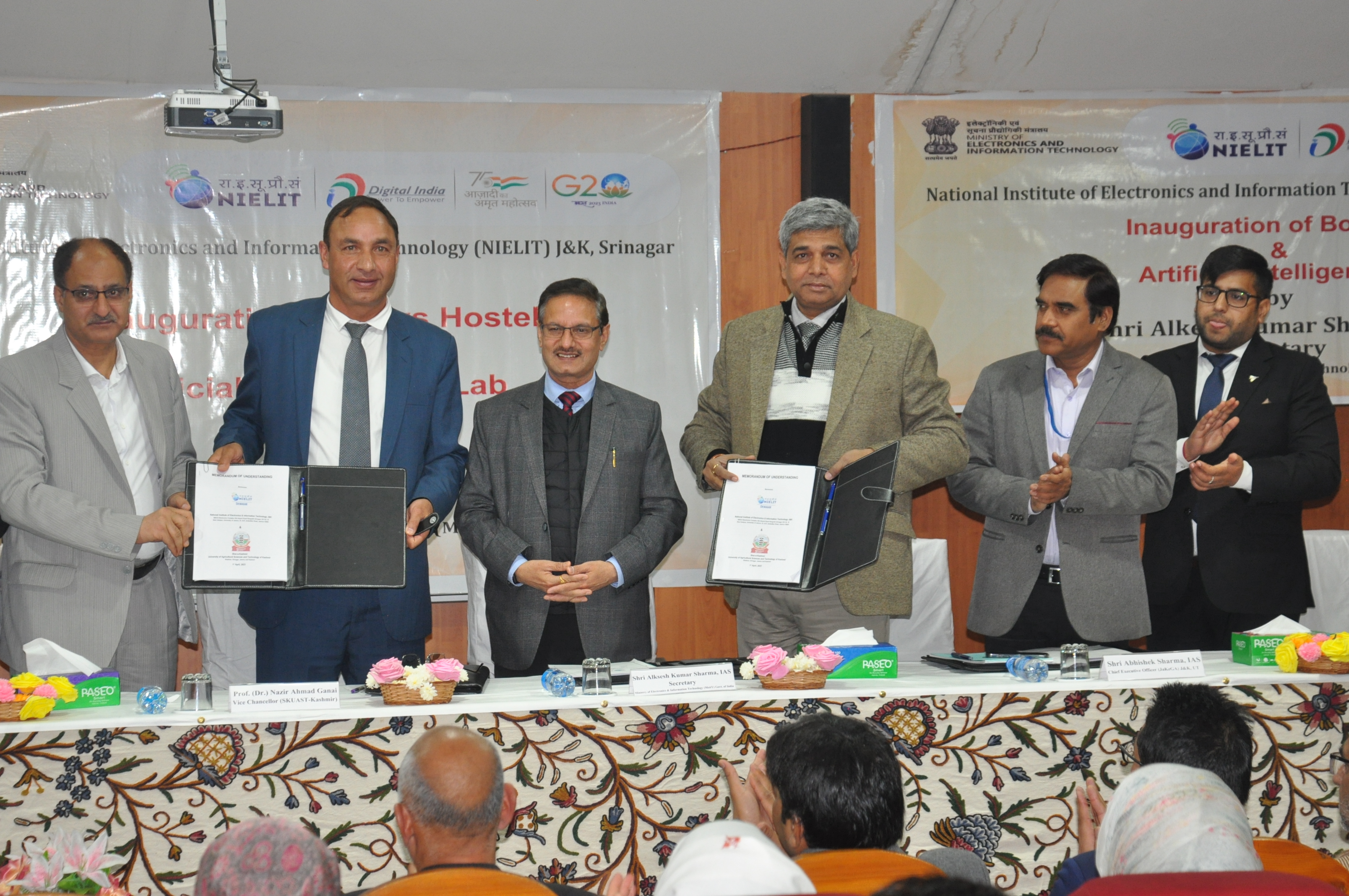 Shri Alkesh Kumar Sharma, Secretary, Ministry of Electronics & Information Technology, Govt. of India inaugurated Boys Hostel and Artificial Intelligence Lab at NIELIT Srinagar on 1st April, 2023. The inauguration function was held at NIELIT campus Srinagar which was graced by Prof. Nazir Ahmad Ganai, Vice Chancellor, Sher-e-Kashmir University of Agricultural Sciences and Technology of Kashmir (SKUAST-Kashmir), Dr. MM Tripathi, Director General, NIELIT; Shri Abhishek Sharma, CEO, Jammu and Kashmir e-Governance Agency (JaKeGA), Government of J&K. A MOU was also signed between Sher-e-Kashmir University of Agricultural Sciences-Kashmir and NIELIT J&K.