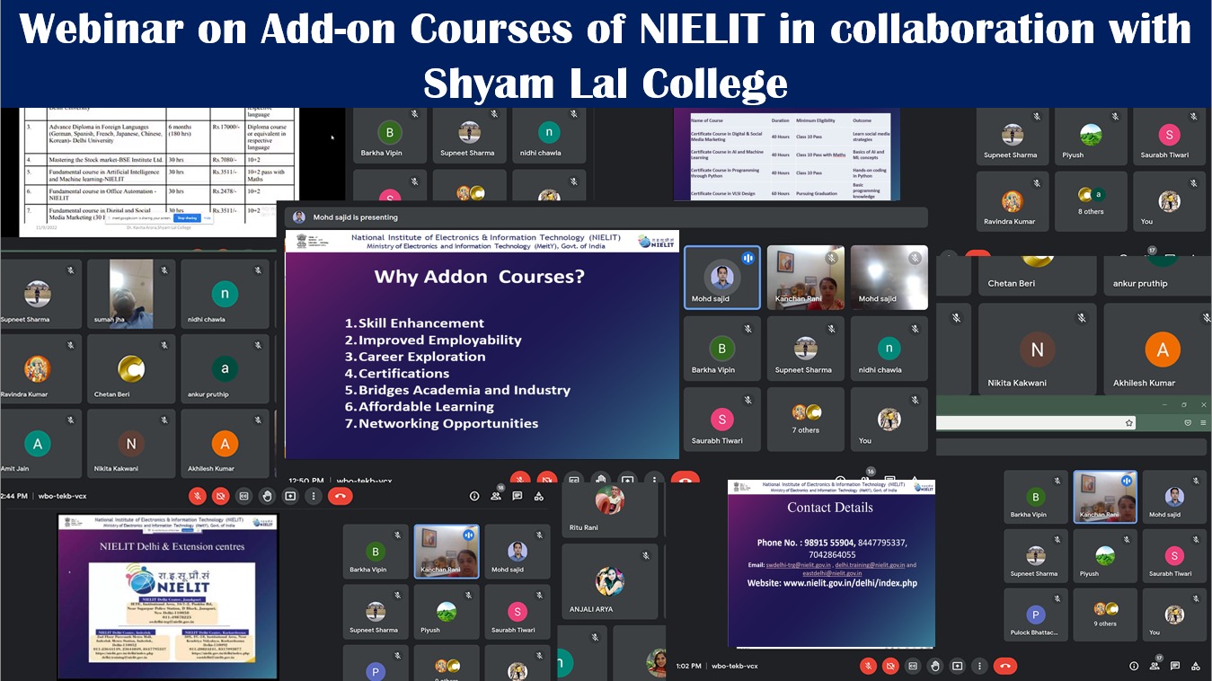 On 26th September 2025, the NIELIT Delhi Centre successfully organized an informative online workshop for the students of Shyam Lal College, University of Delhi. The session aimed to orient students about NIELIT, its role as a premier government institute, and the wide range of courses offered to enhance technical skills and employability.