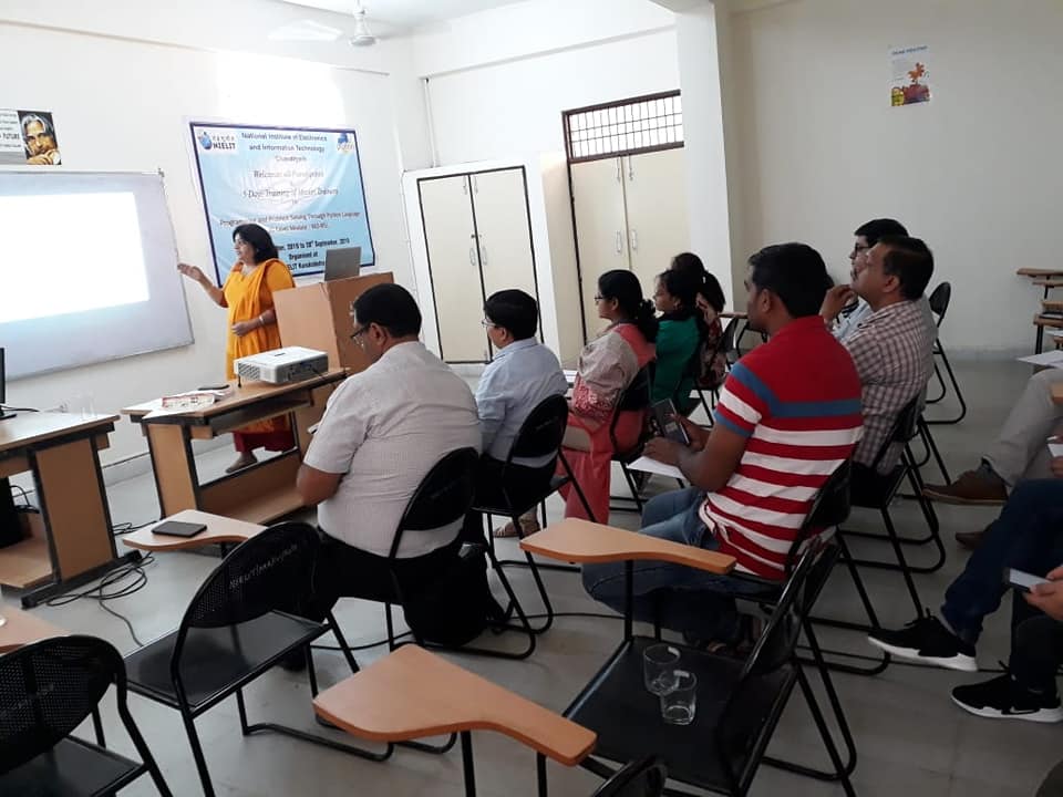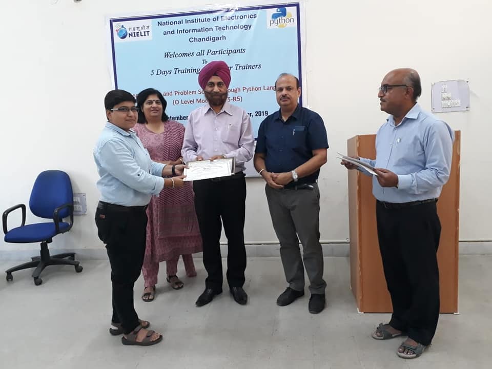 A 5 days training of Master Trainers was conducted on "Programming and Problem Solving through Python". It was conducted by NIELIT Chandigarh for officials of various centres of NIELIT at NIELIT Kurukshetra. Certificates were distributed to the candidates