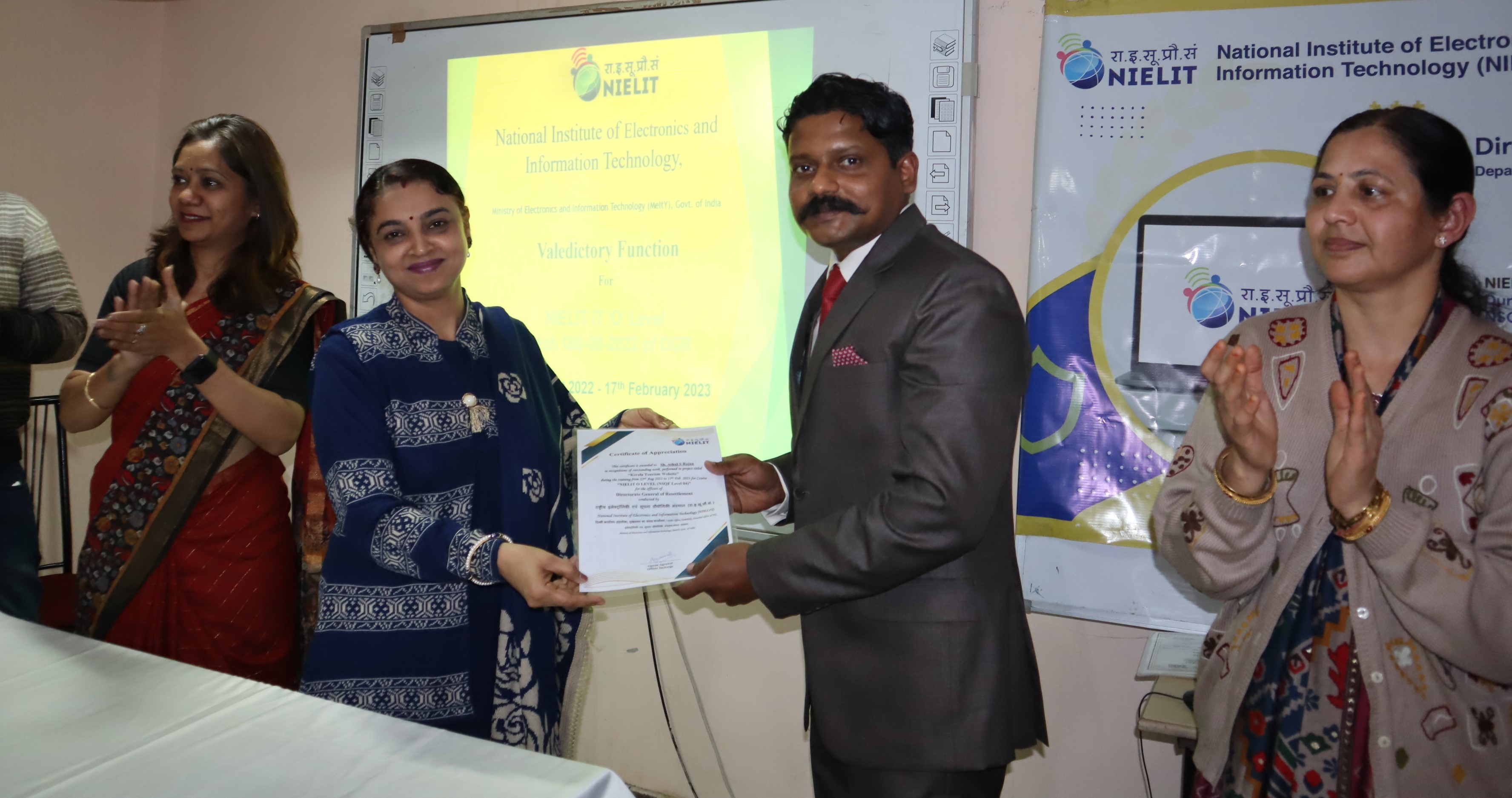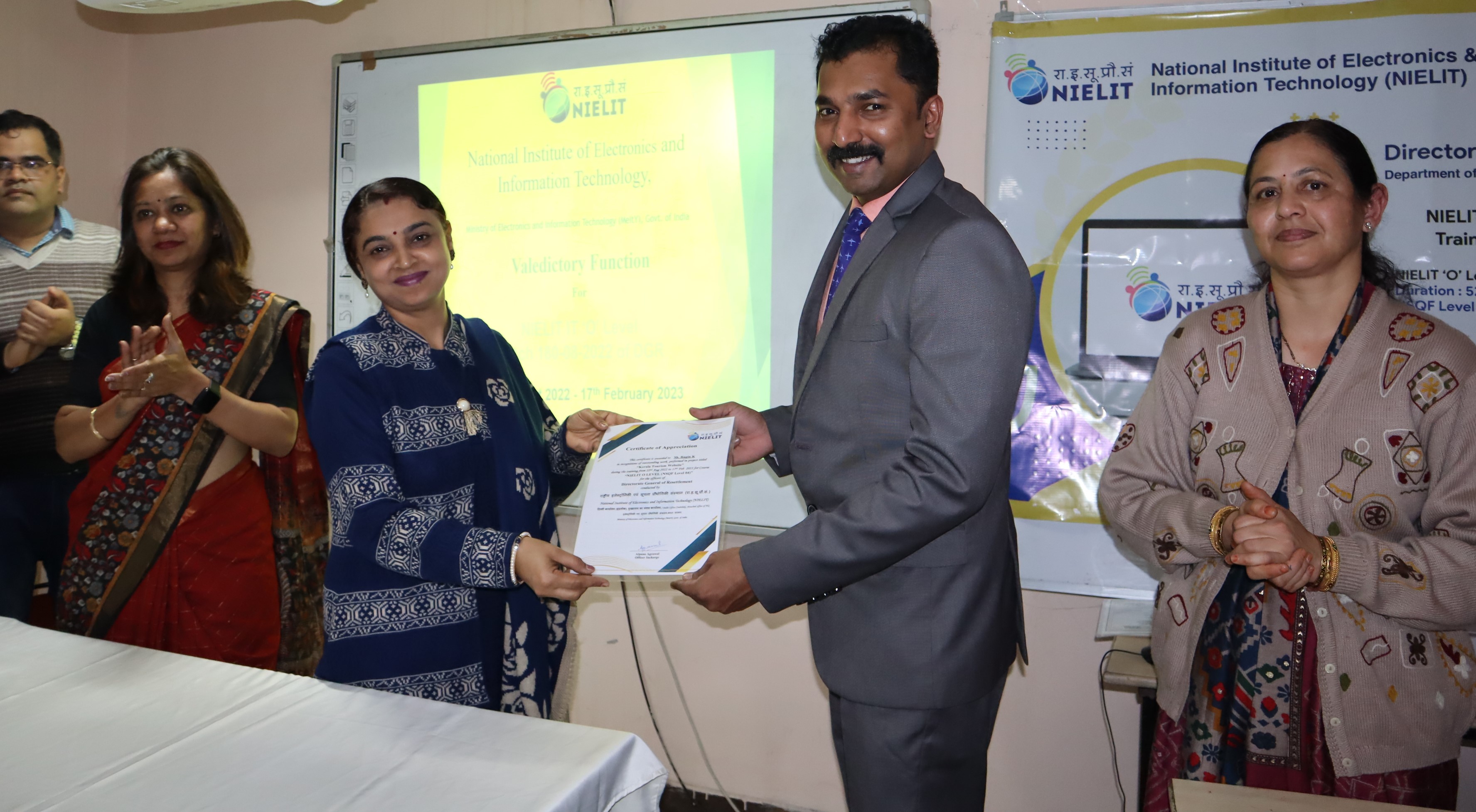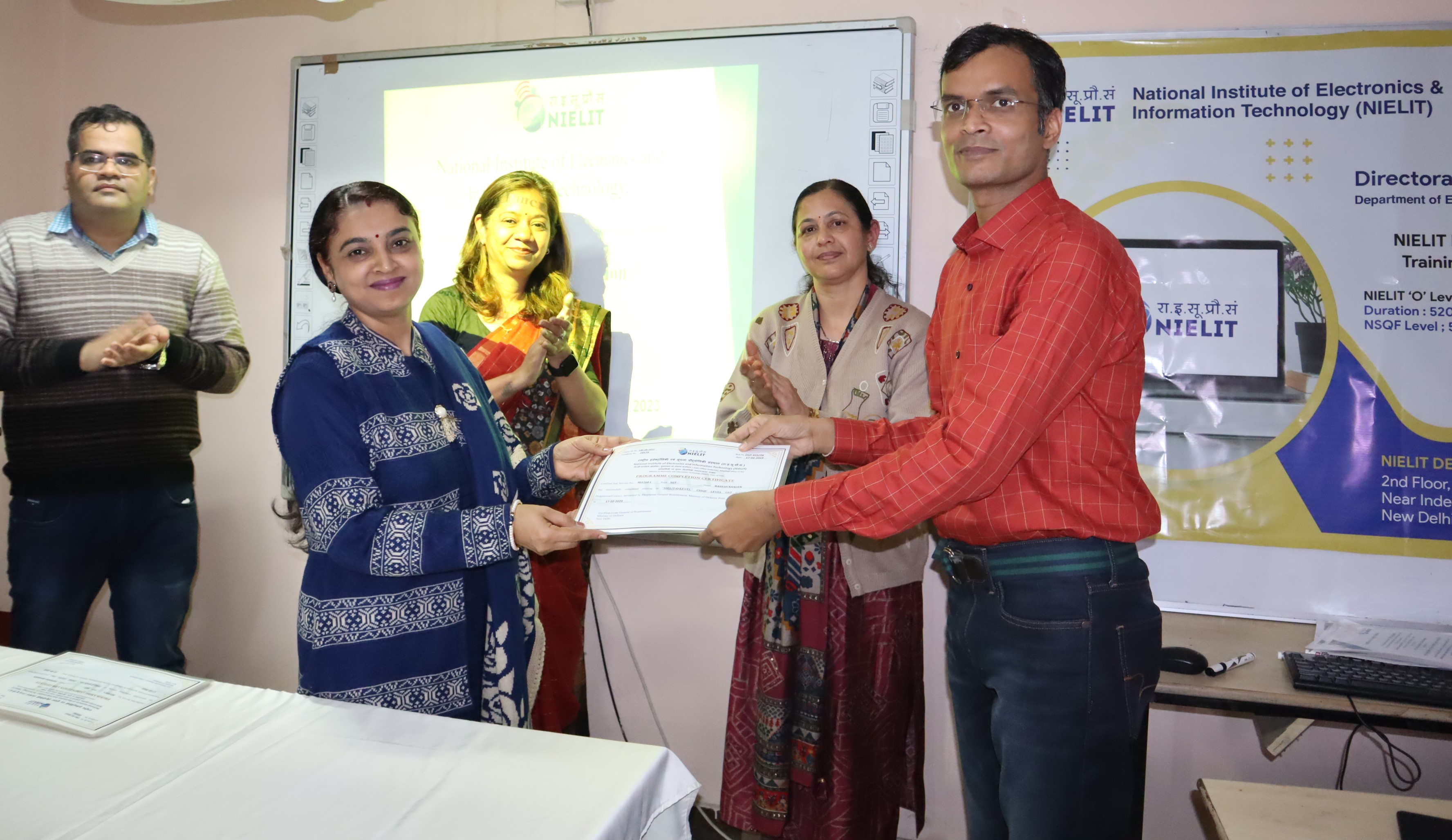 The valedictory programme for the batch of NIELIT O Level course was conducted on 17th February 2023. Ms. Kanchan Rani, Joint Director(Sys) NIELIT Delhi Office along with Joint Director, Swapnali Naik awarded Certificates to all officials and felicitated them for their successful completion of training.