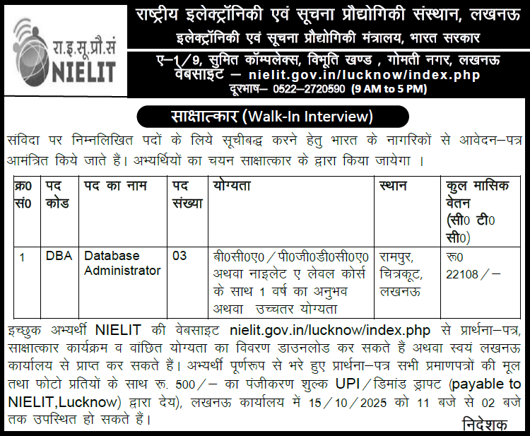 Walk in Interview for the post of Database Administrator on Contract Basis on 15/10/2025 at NIELIT Lucknow.