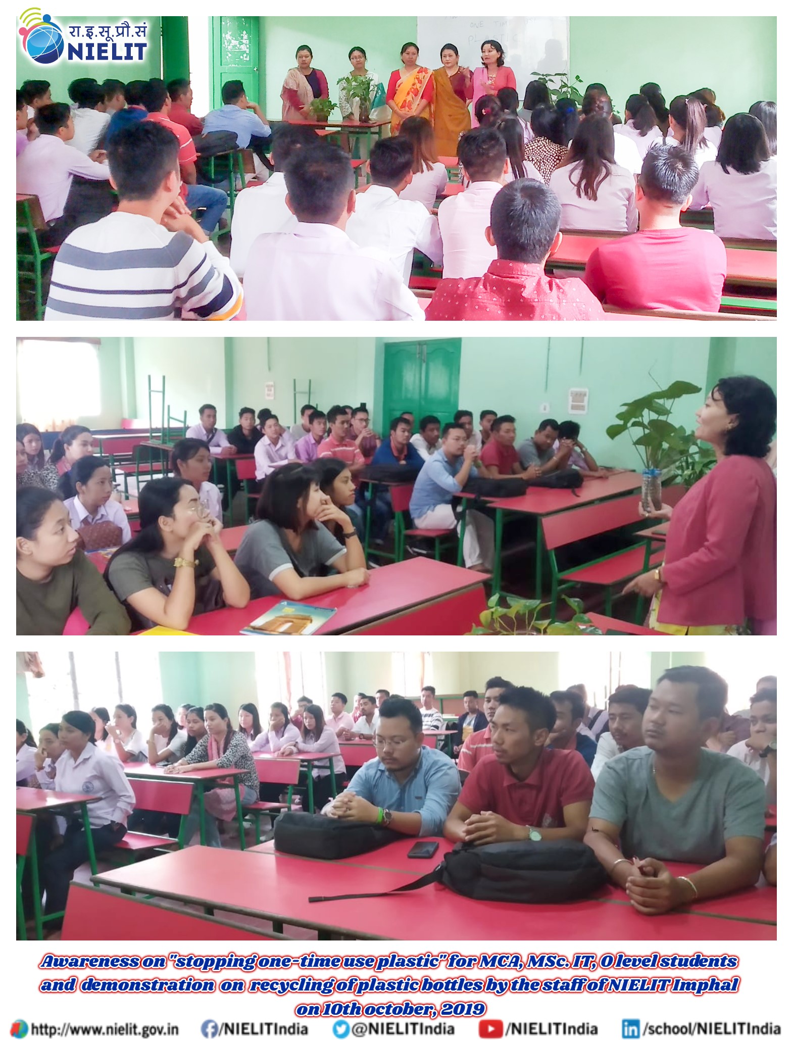 Awareness on "Stopping one time use plastic" for MCA, MSc. IT & 'O'- level students and demonstration on recycling of plastic bottles by the staff of NIELIT Imphal on 10th october, 2019 as a part of Swachh hi Seva.