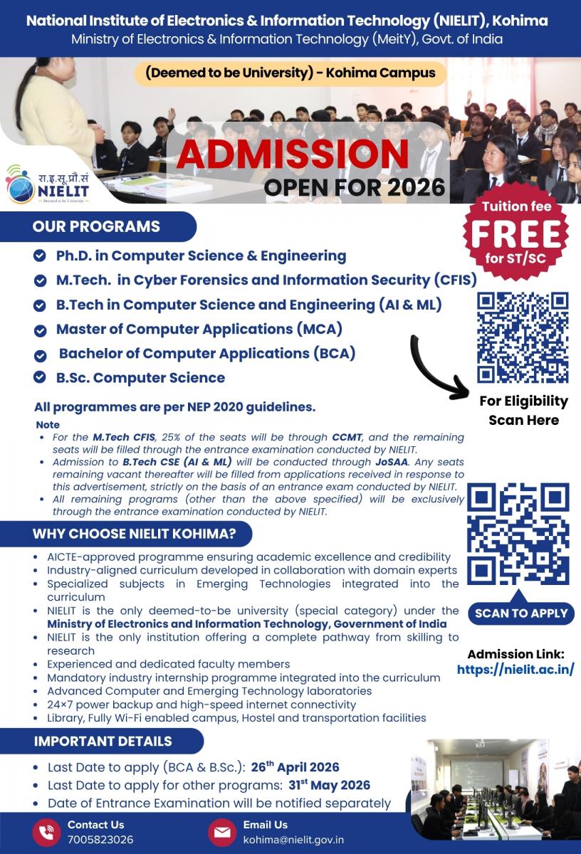 Admission Notice for the academic session 2026 – 2027 for the programs - Ph.D. in Computer Science & Engineering, M.Tech. in Cyber Forensics and Information Security (CFIS), B.Tech in Computer Science and Engineering (AI & ML), Master of Computer Applications (MCA), Bachelor of Computer Applications (BCA), B.Sc. Computer Science. Tuition fee is exempted for SC/ST candidates