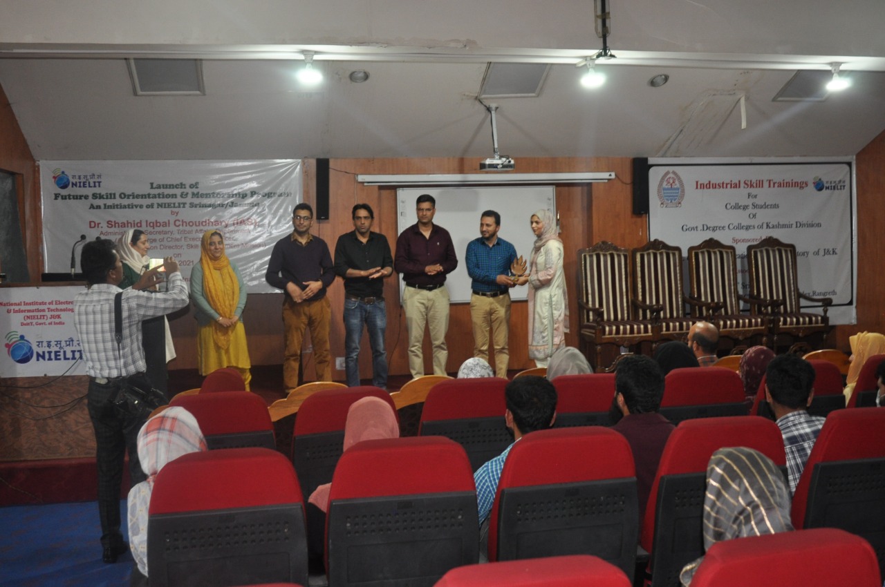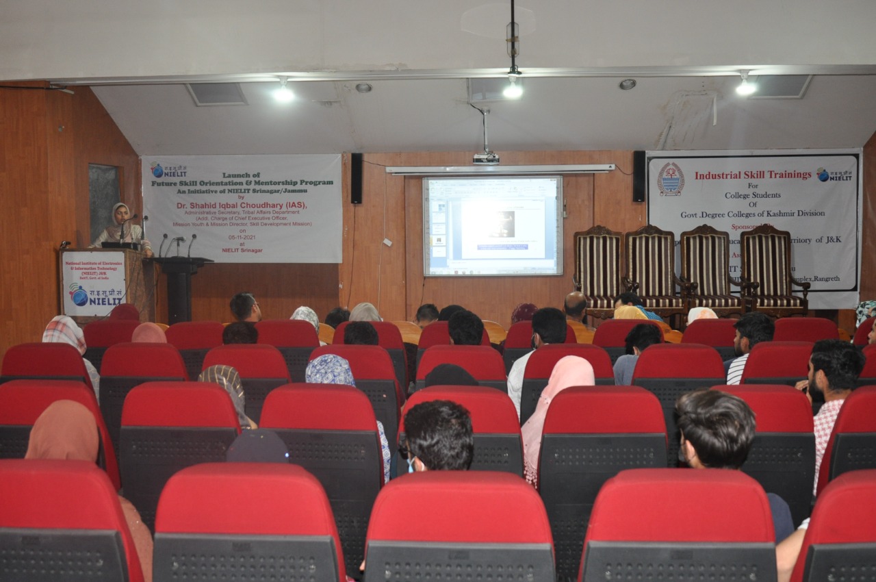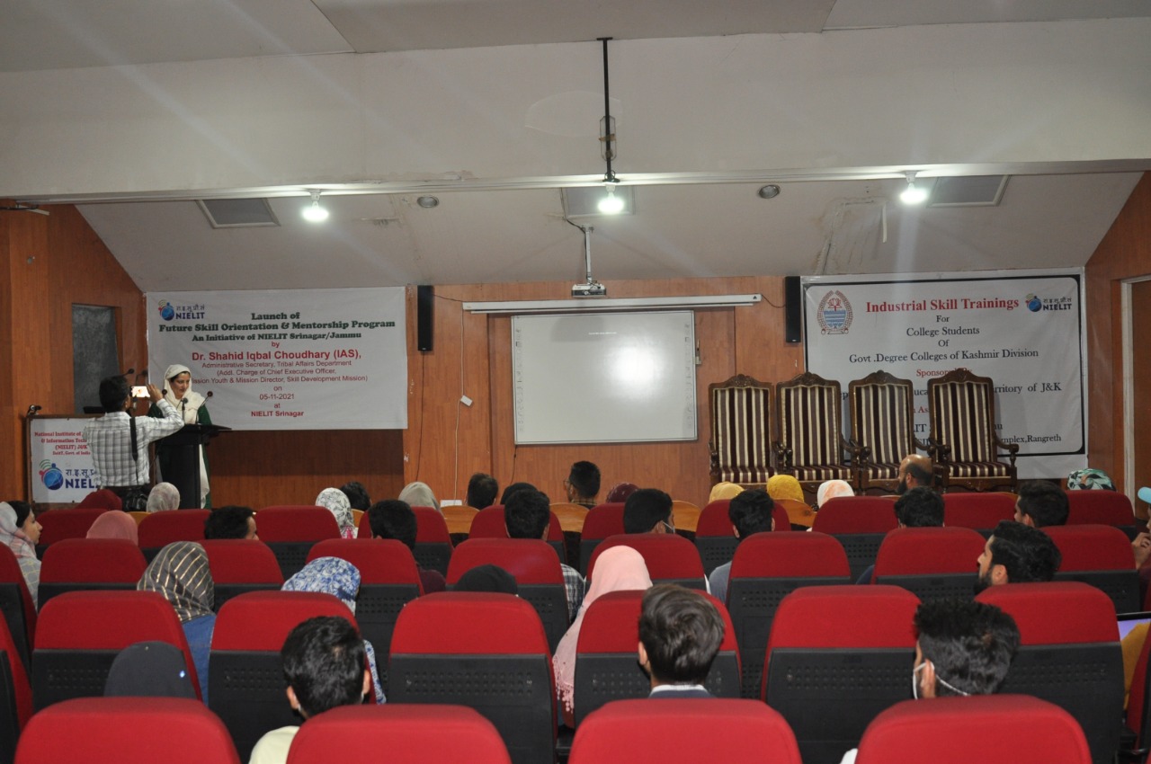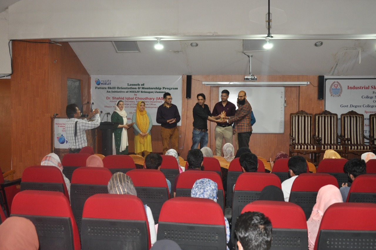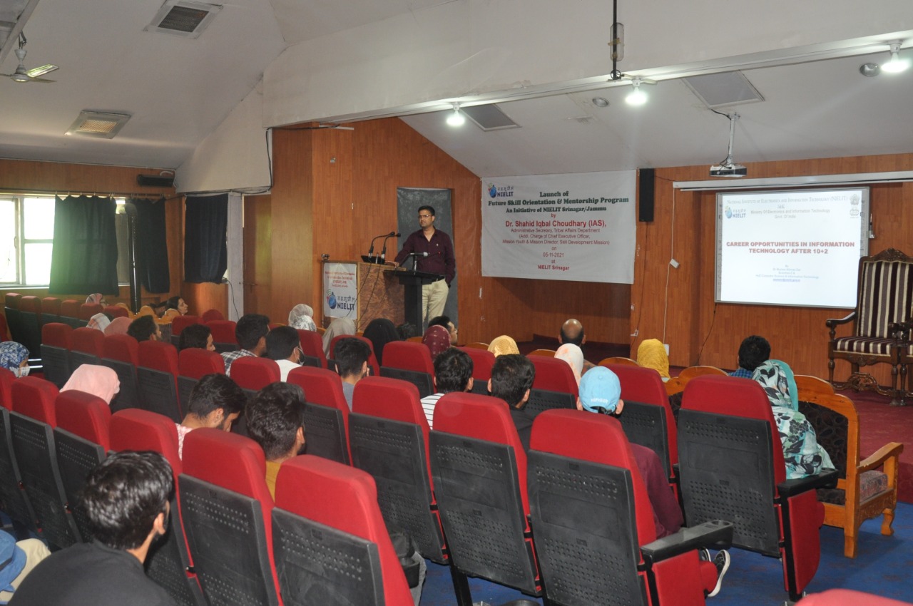 Sh.Ashaq Hussain Dar Officer In-charge NIELIT Srinagar gave a brief introduction about NIELIT and its various Skill Development Courses which are introduced for the benefit of the students. Dr Muneer Ahmad Dar, HoD (CS and IT), NIELIT Srinagar discussed about the career opportunities after 10+2 and asked the students to join various formal courses(BCA, BSc-IT, MCA and MSc-IT) and non formal courses (O/A/B level) under NIELIT J&K. Sh.Mudasir Bhat, VP Artificial Intelligence LeLafe IT Solutions and Andleeb Fatima ML Engineer alumni of NIELIT Srinagar presented their journey of success in a motivational speech. They talked about the qualified faculty, par excellence infrastructure and high quality of education being imparted at NIELIT Srinagar and emphasized upon the students to join NIELIT Srinagar for pursuing their education after 10+2.