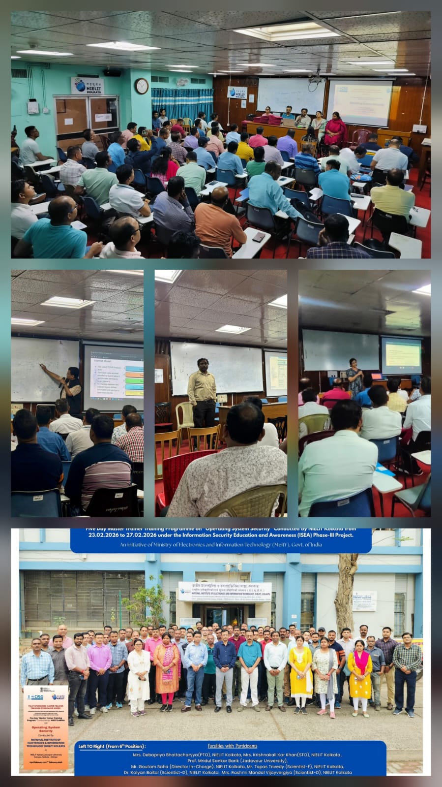 राष्ट्रीय इलेक्ट्रॉनिक्स एवं सूचना प्रौद्योगिकी संस्थान (NIELIT कोलकाता) ने “ऑपरेटिंग सिस्टम सिक्योरिटी” मॉड्यूल पर पाँच दिवसीय मास्टर ट्रेनर प्रशिक्षण कार्यक्रम का सफलतापूर्वक आयोजन 23 से 27 फरवरी 2026 तक किया। यह कार्यक्रम इलेक्ट्रॉनिक्स एवं सूचना प्रौद्योगिकी मंत्रालय (MeitY), भारत सरकार की सूचना सुरक्षा शिक्षा एवं जागरूकता (ISEA) पहल के Phase–III के अंतर्गत आयोजित किया गया। इस कार्यक्रम में प्रतिभागियों की उत्साहपूर्ण भागीदारी रही और यह साइबर सुरक्षा में राष्ट्रीय क्षमता निर्माण की दिशा में एक महत्वपूर्ण उपलब्धि साबित हुआ।