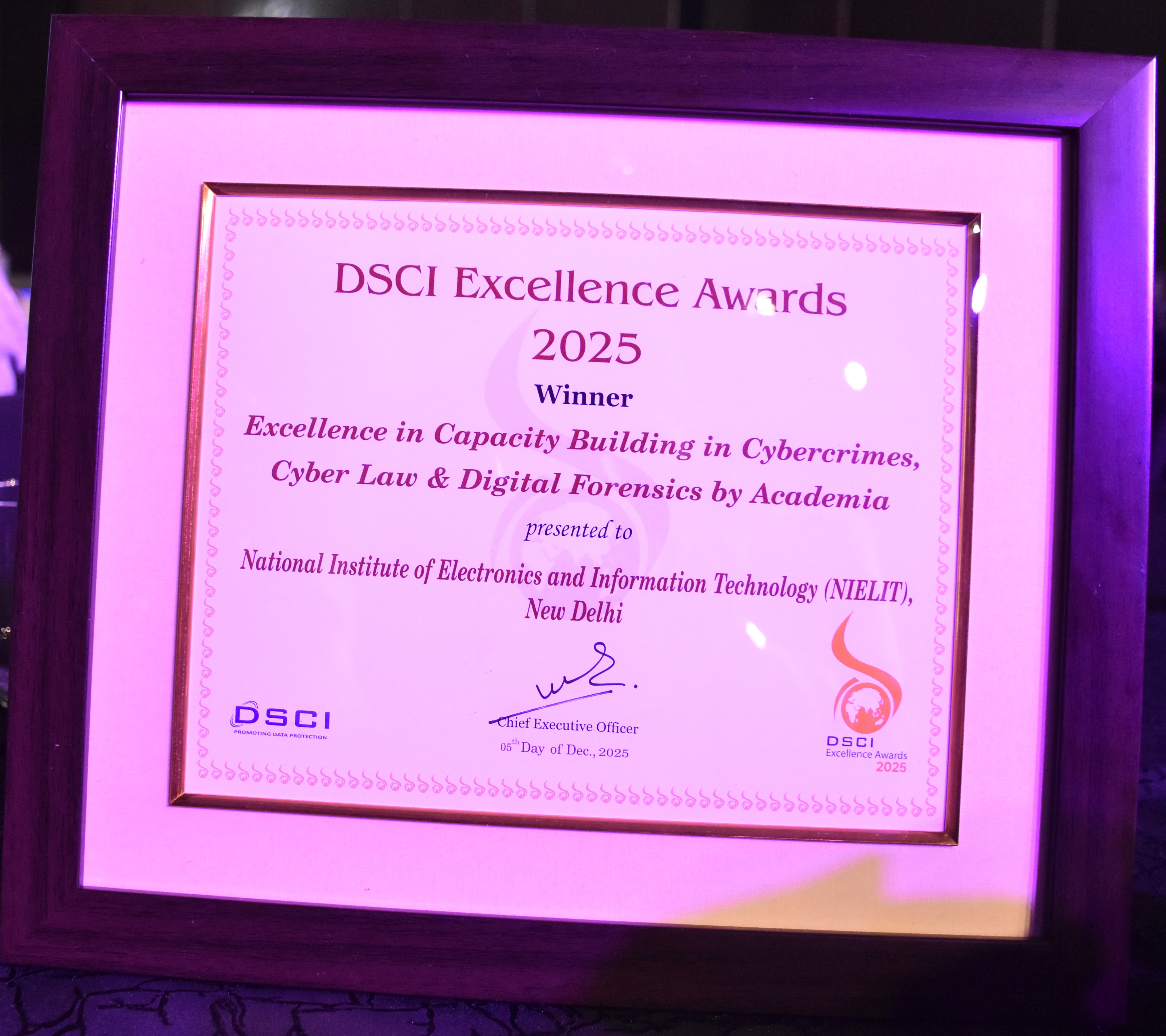 We are honoured to be awarded the DSCI Excellence Award for Excellence in Capacity Building in Cybercrimes, Cyber Laws & Digital Forensics (Academia). This recognition strengthens NIELIT’s commitment to building a digitally secure India.