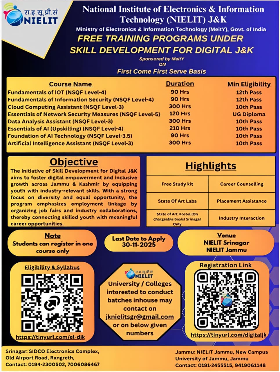 NIELIT Bhawan, Plot No. 3, PSP Pocket, Sector-8, Dwarka, New Delhi-110077, Board No.: 011-44446777 Help Desk No: 011-44446771 [Mon-Sat,9AM-5:30PM] Email:- contact[at]nielit[dot]gov[dot]in
