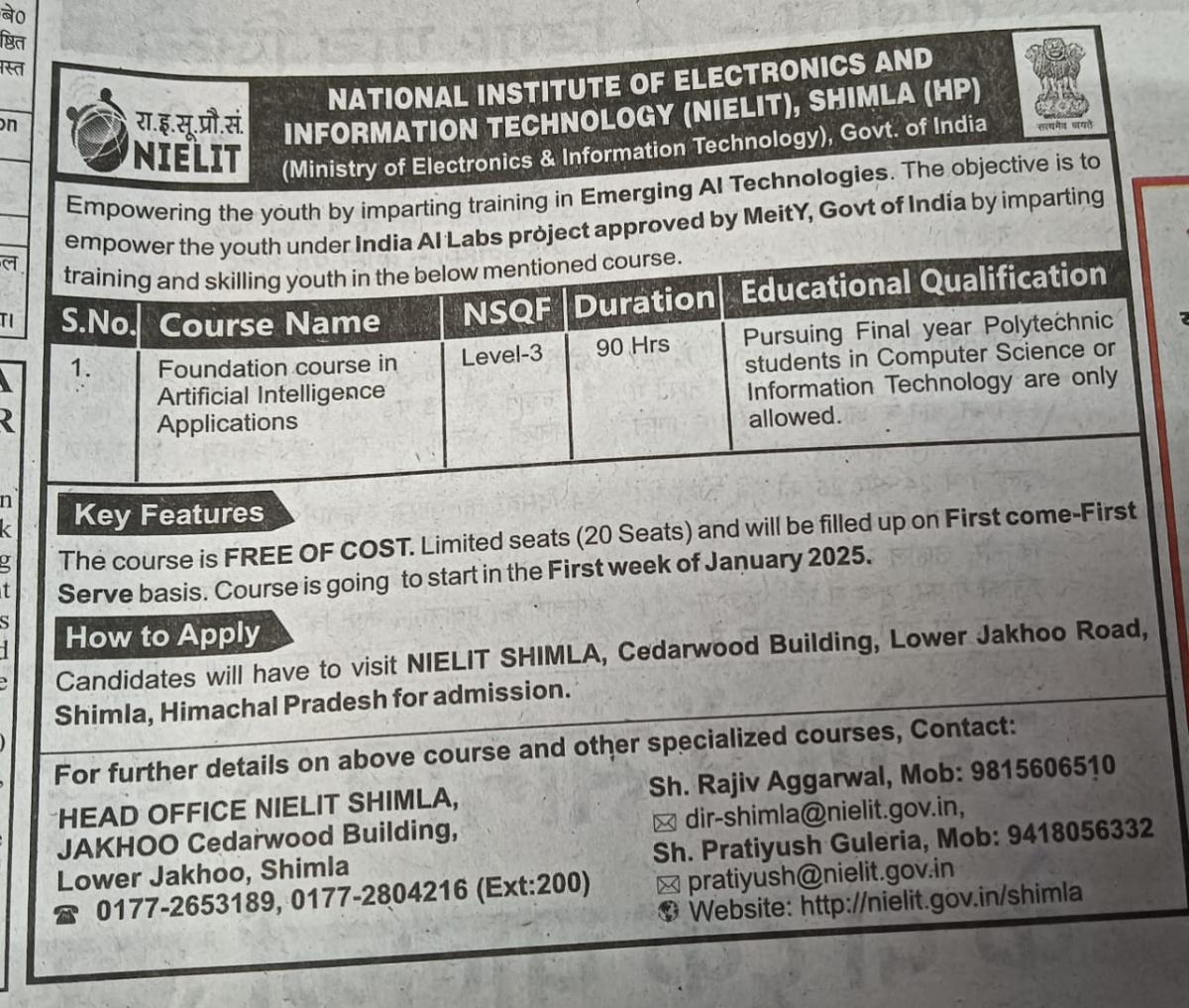 NIELIT, Shimla Cedarwood building Jakhoo road Jakhoo, Shimla – 171001 Himachal Pradesh.